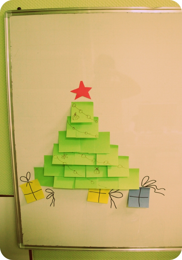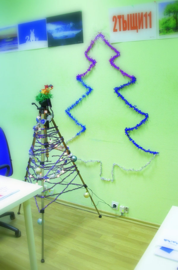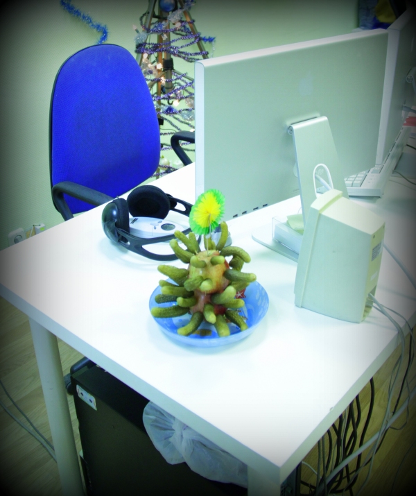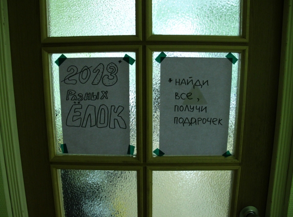 Итак, вчера в бой вступили дизайнеры! 13 ёлок разного диаметра, формы и наполнения — такова дизайнерская концепция. Каждому вошедшему в кабинет предлагалось проявить свою фантазию, и обнаружить 13 новогодних красавиц. Тому, кто находил все явные и тайные ёлки, вручали приз, и ни хухры-мухры, а твиксы, чупики, штрудели, киндер-шоколад, а особо желающим — кусочек солёно-огурцовой ёлки!