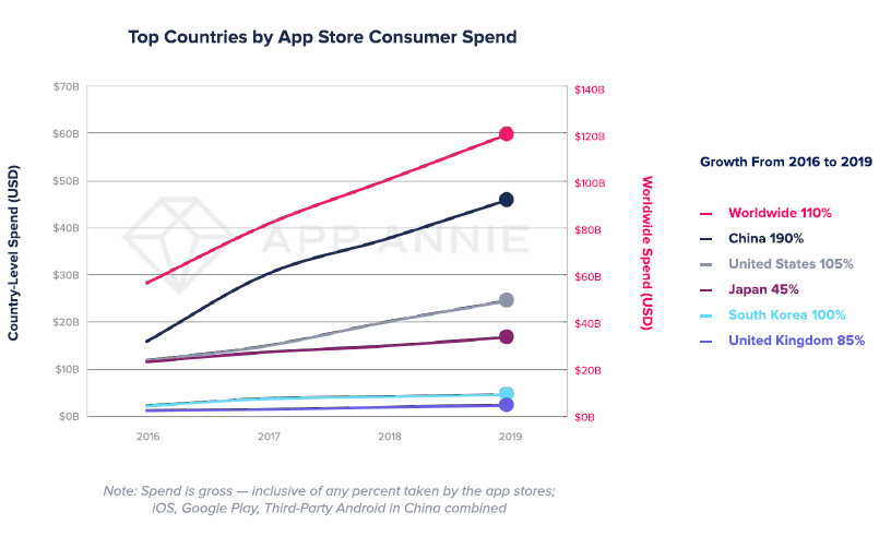 С каждым годом количество установок приложений в мире растёт. Пользователи тратят на мобильные приложения больше денег: с 2016 по 2019 год глобальный рост затрат достиг 110%. С привязкой к карте покупать со смартфона удивительно легко. Поэтому во всём мире с 2018 по 2019 год люди провели на 20% больше времени в приложениях магазинов.