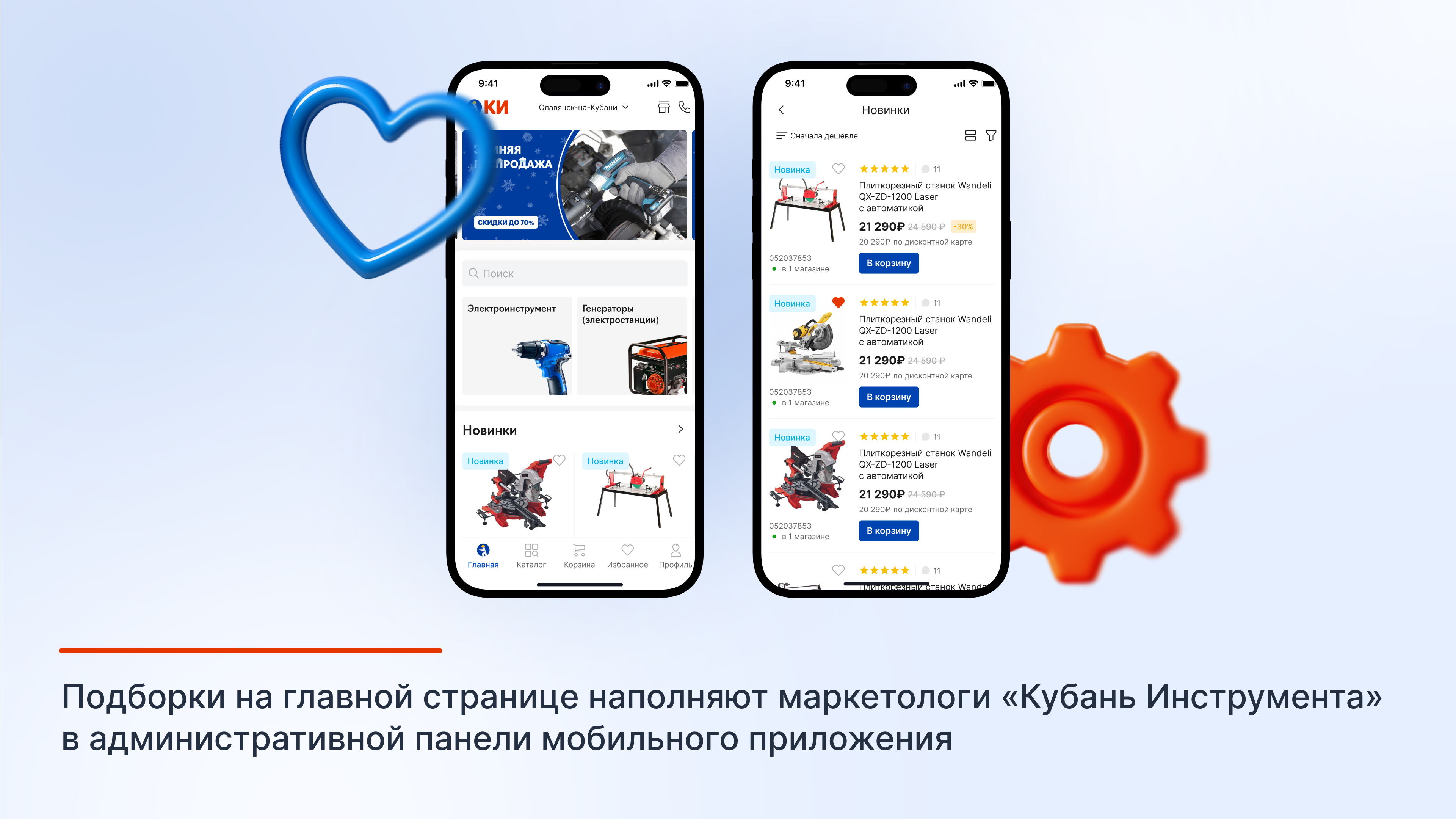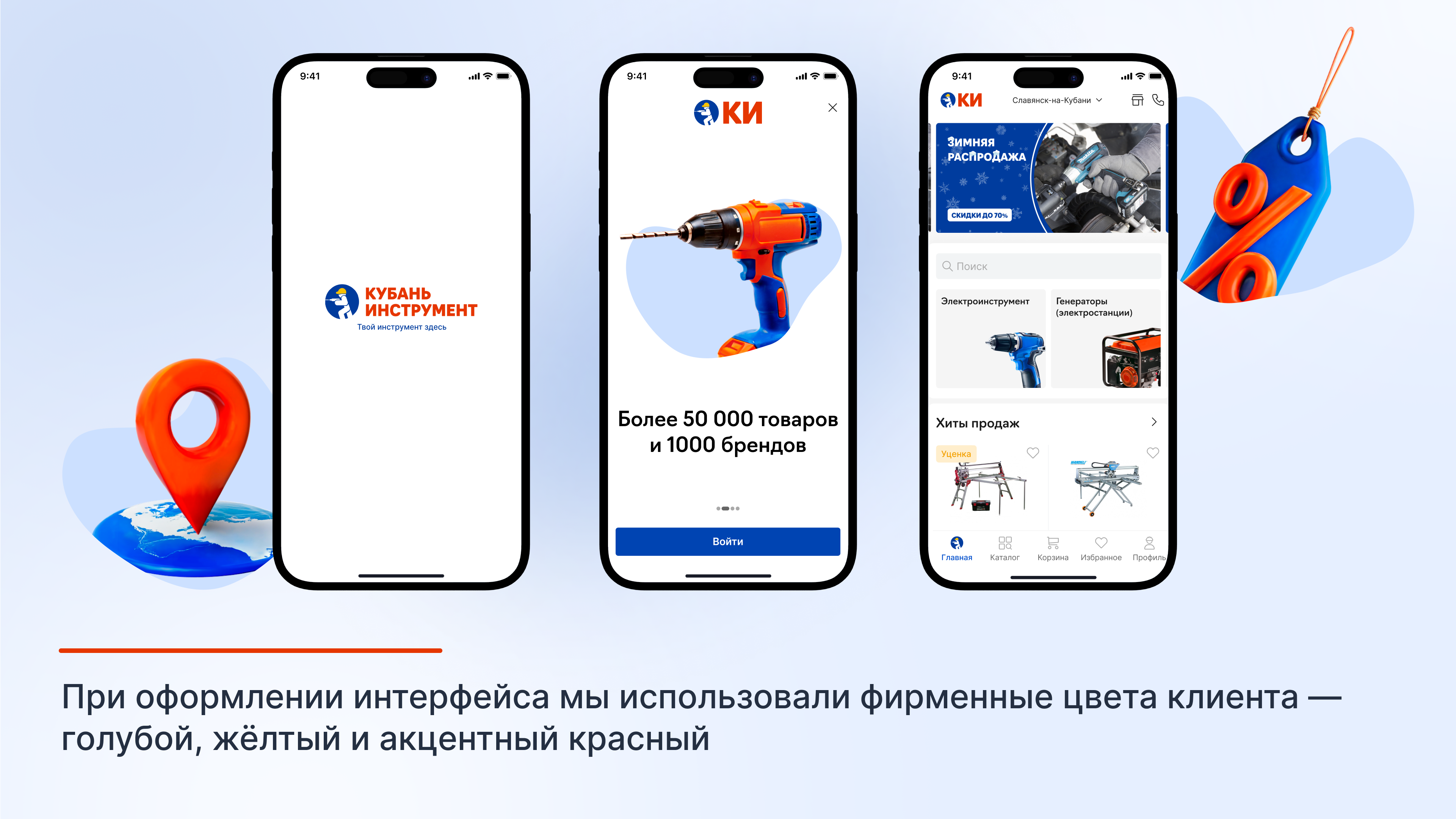 Мобильное приложение «Кубань Инструмента» состоит из пяти основных разделов: главного экрана, каталога, корзины, «Избранное», профиля пользователя.