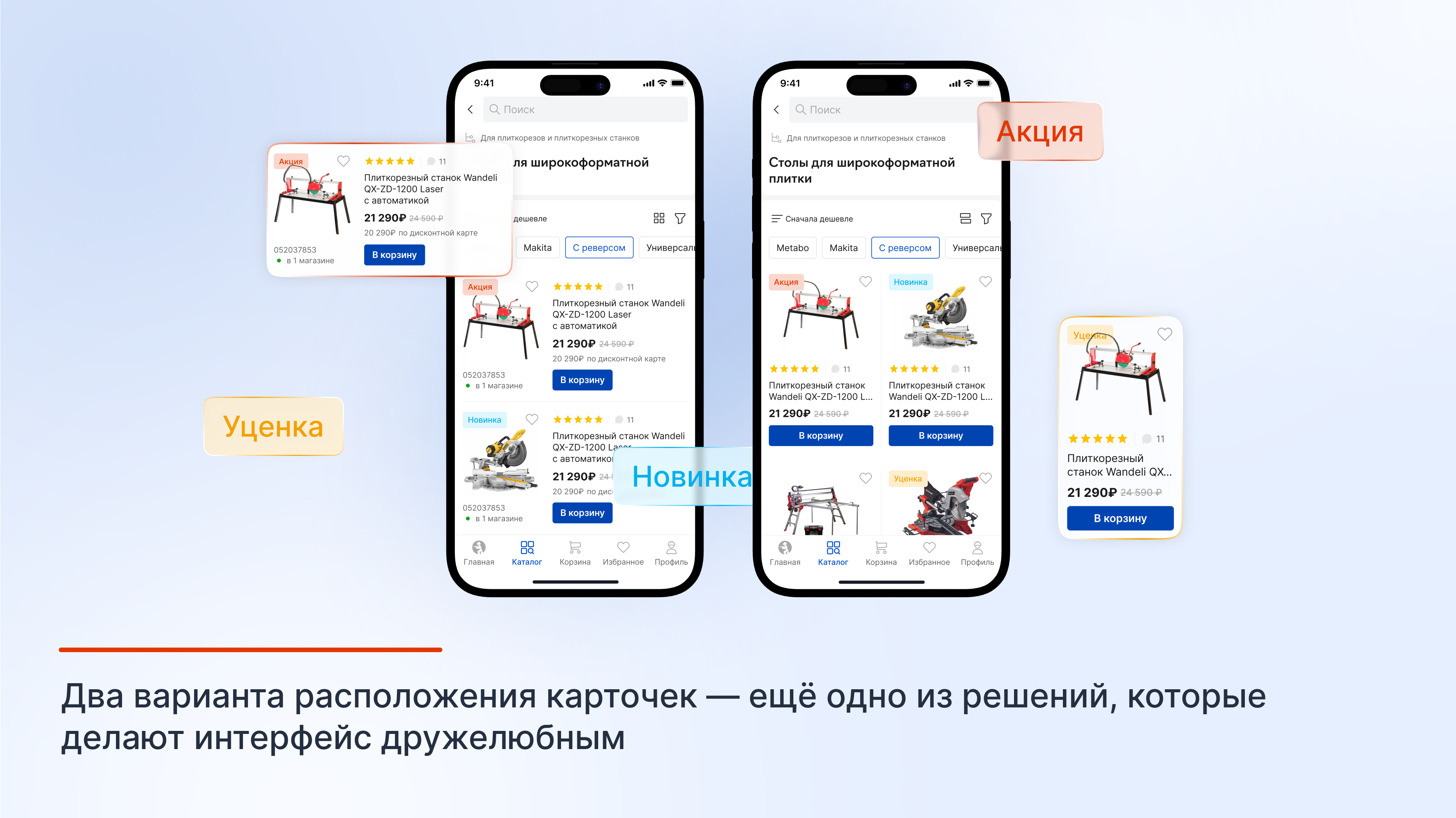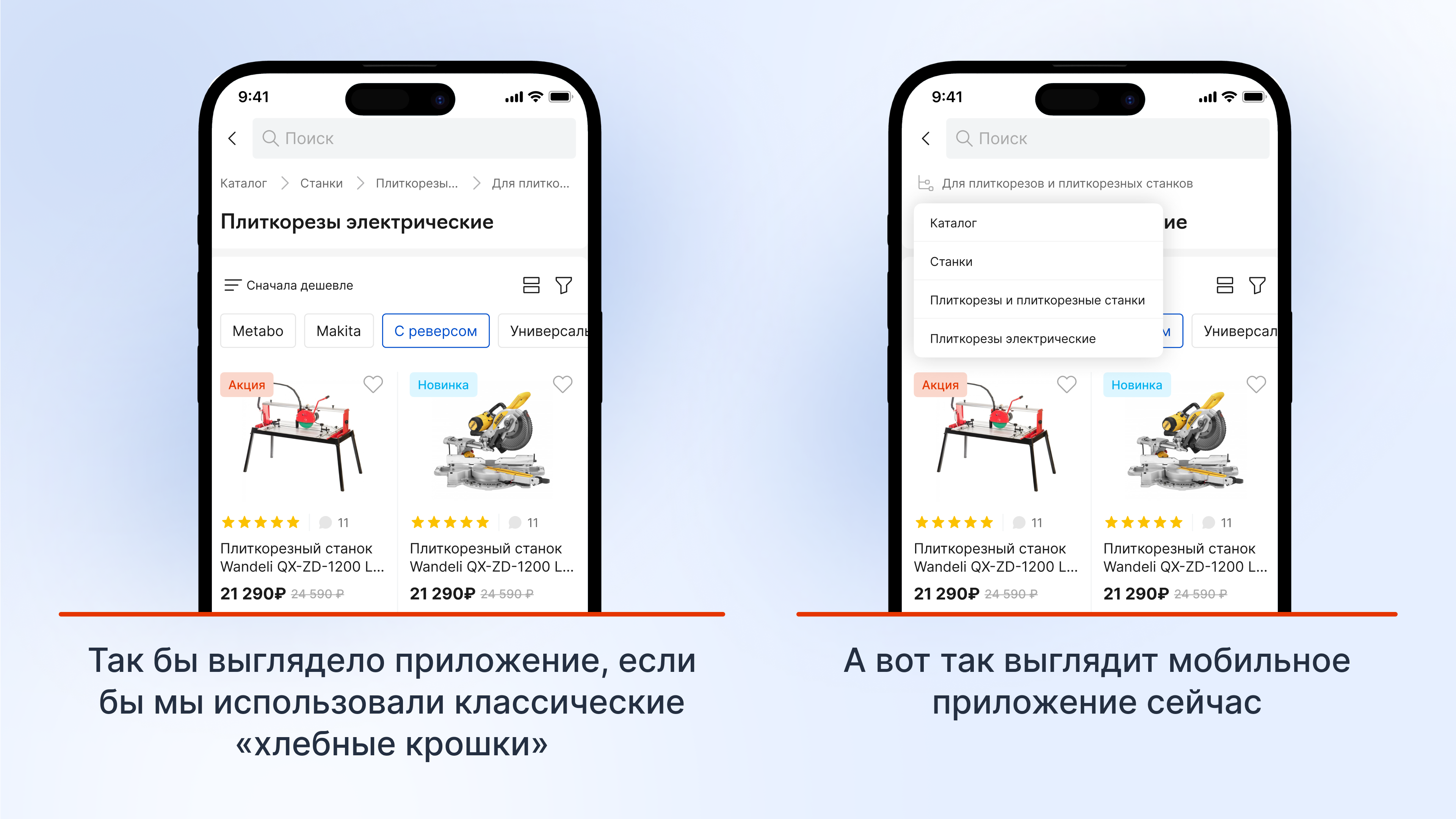 Во-вторых, было важно расположить большое количество элементов на экране так, чтобы покупатели легко находили нужные товары в каталоге. Особенно, учитывая, что названия товаров могли быть очень длинными и занимать много места на экране смартфона — это ещё одна из специфик любого строительного магазина.
