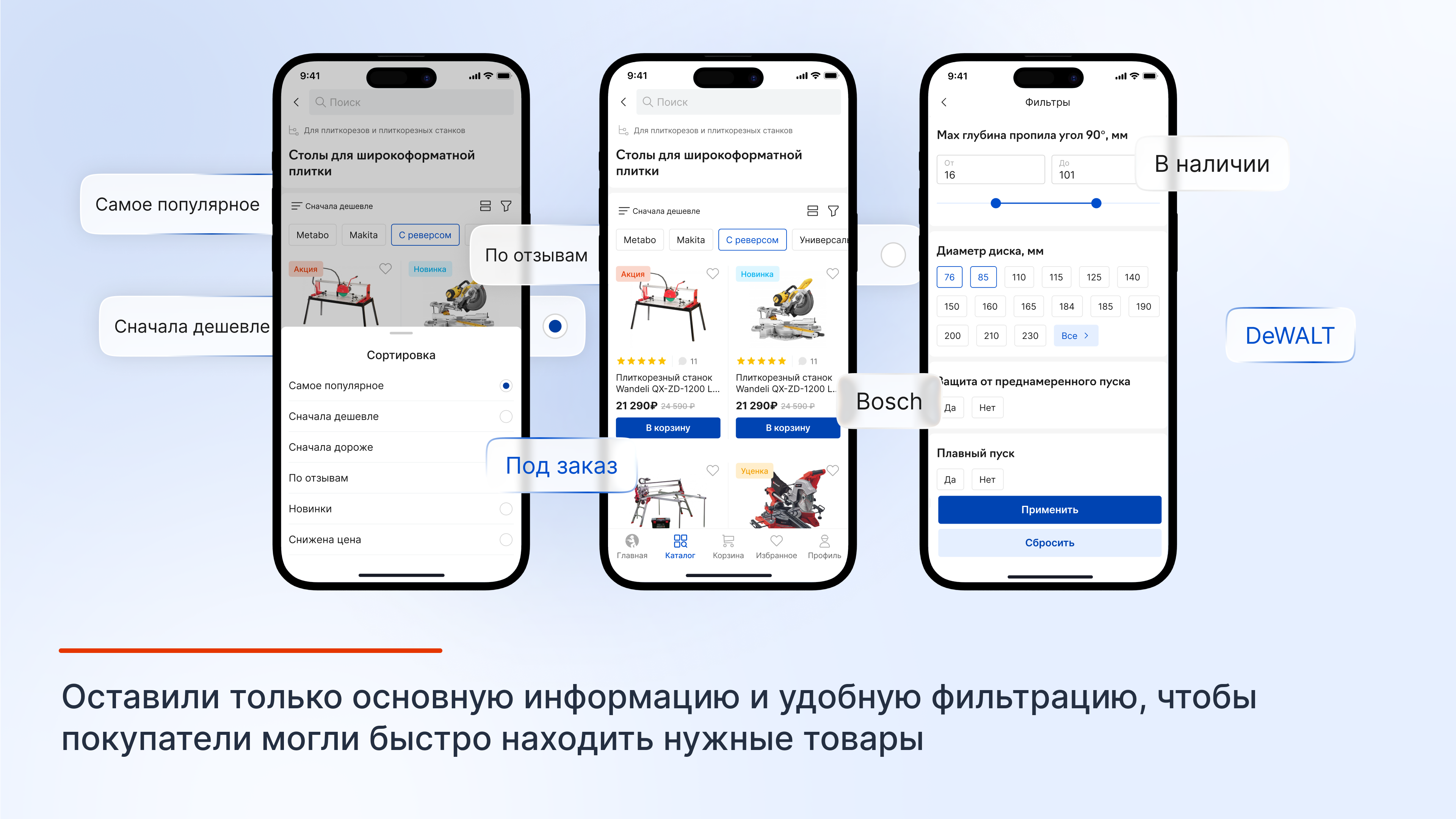 Также настроили фильтры таким образом, чтобы они подстраивались под каждую подкатегорию. Например, в «Дисковых пилах» можно выбрать напряжение аккумулятора и максимальную глубину пропила под разными углами, а в «Строительных аккумуляторных пылесосах» — расход воздуха и объём бака.