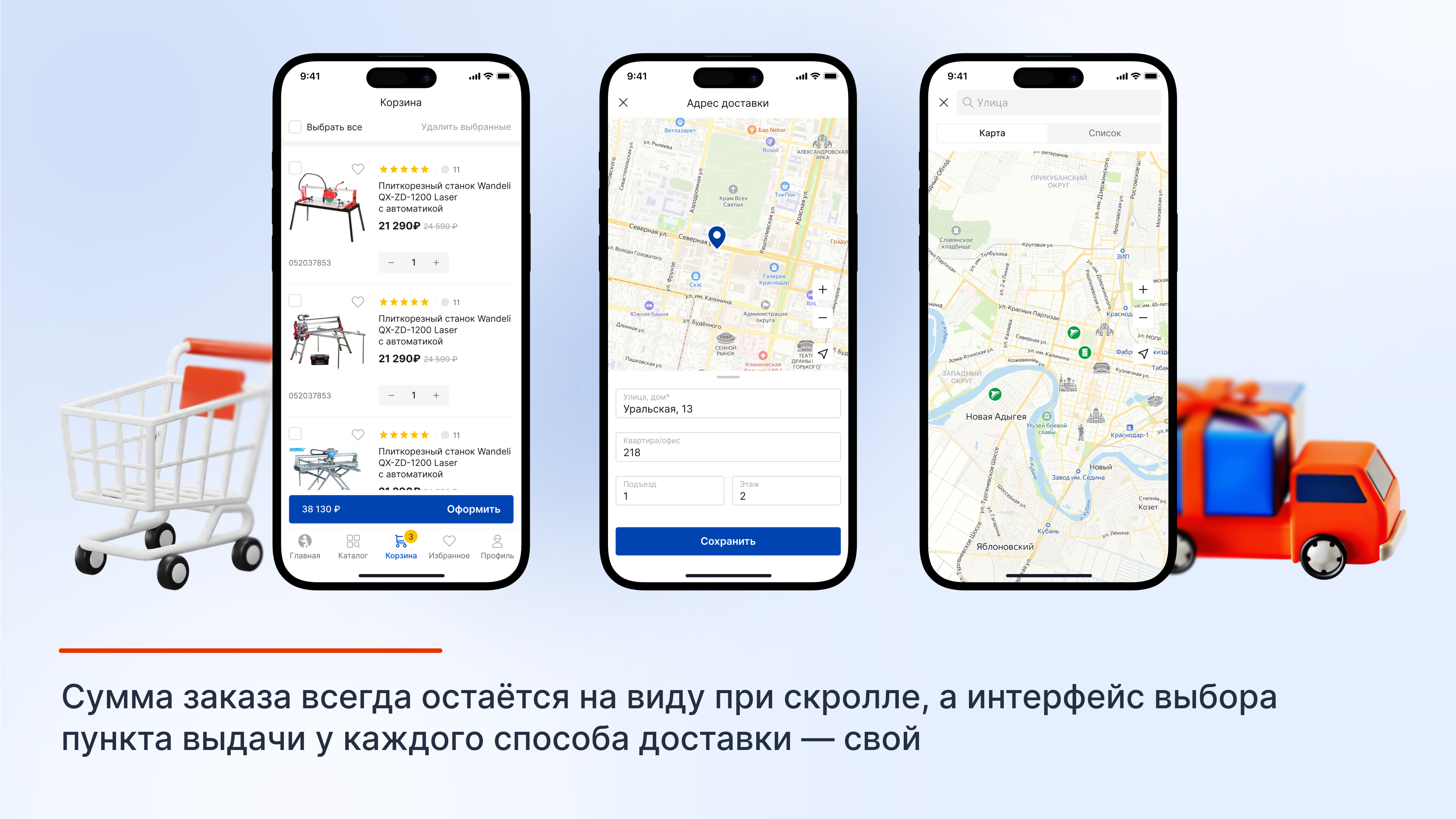 Спроектировали интерфейс таким образом, чтобы покупатель всегда видел общую сумму, а в нижней части экрана добавили подборку с сопутствующими товарами — для увеличения продаж и среднего чека.