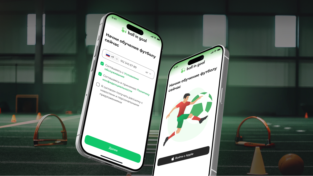 Сначала мы добавили авторизацию по номеру телефона, но спустя некоторое время после релиза, заменили её на вход через аккаунт в Apple или Google. Причина: маркетологи клиента проанализировали аудиторию и выяснили, что пользователи США подозрительно относятся к авторизации по номеру телефона, потому что спам-звонки в их стране — большая проблема. Поэтому, чтобы не терять потенциальных клиентов, Ball In Goal попросили изменить способ авторизации. В итоге, как нам рассказал клиент, количество пользователей выросло на 10 000. В то время как за первые два месяца до смены способа авторизации в приложении зарегистрировались 1000 человек.