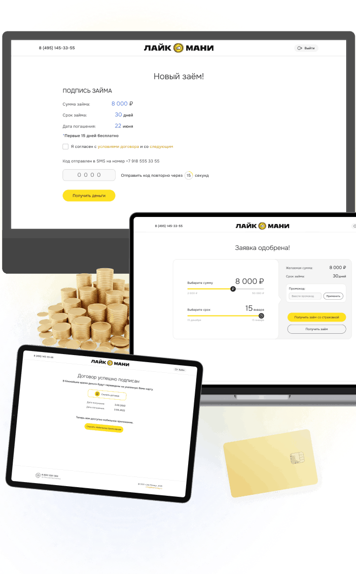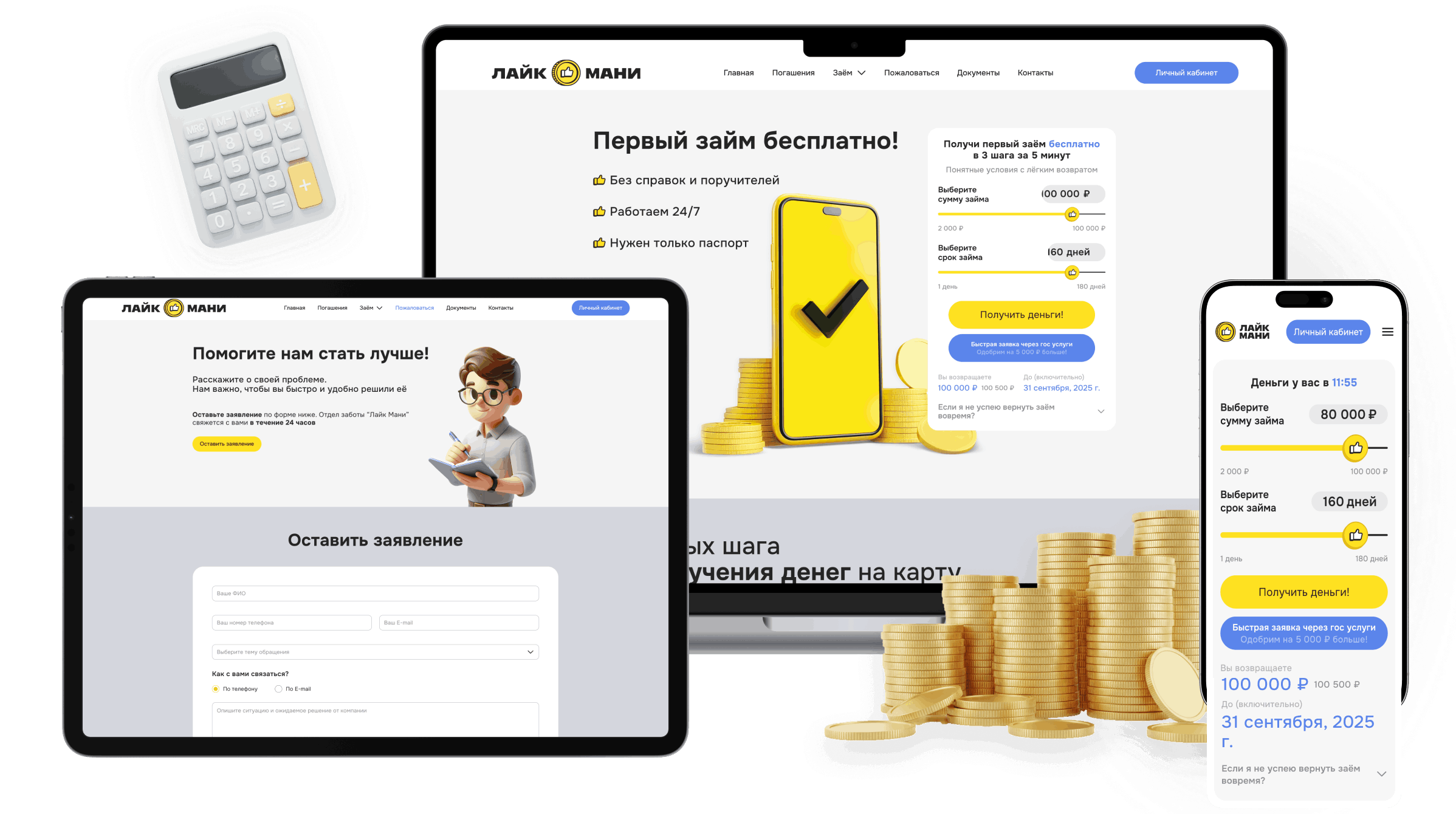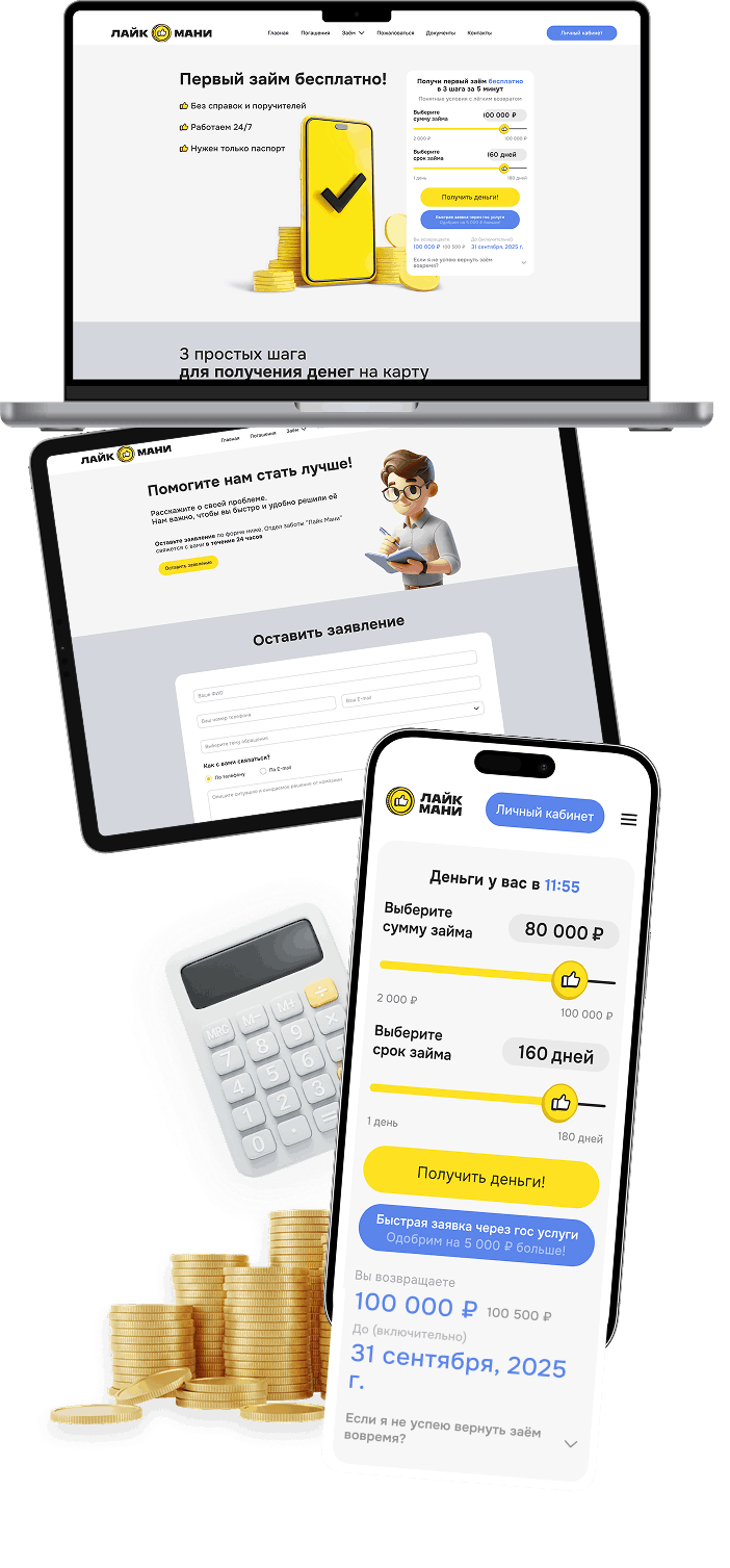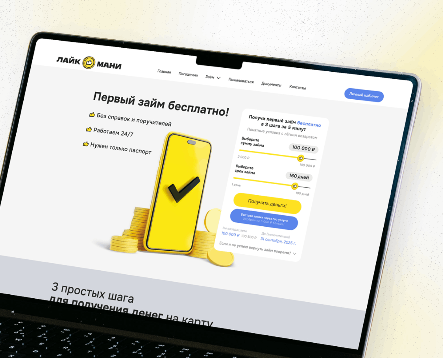 Дизайн лендинга, функционал формирования полной заявки на заём и личный кабинет заёмщика на сайте сервиса онлайн-заёмов LikeMoney