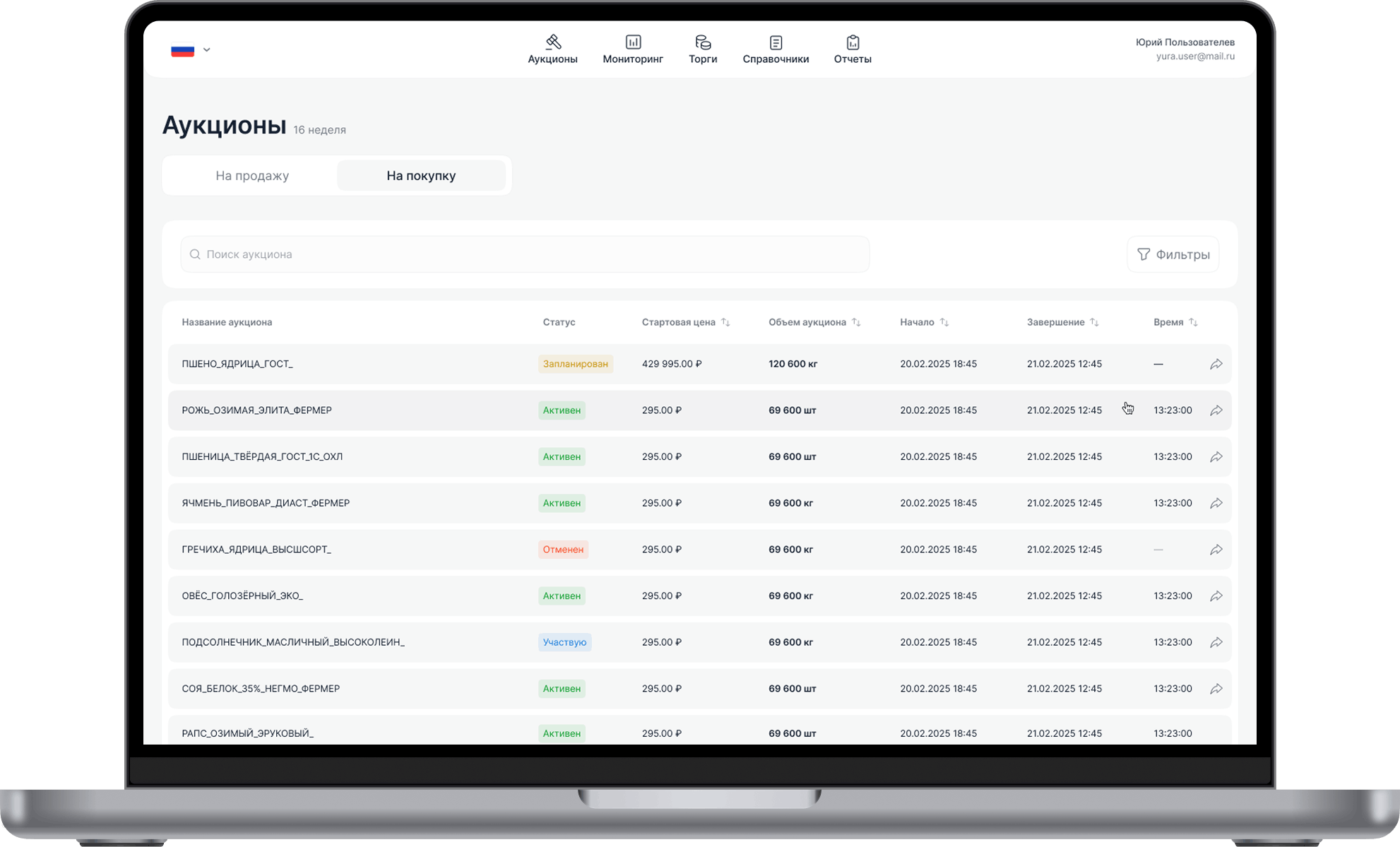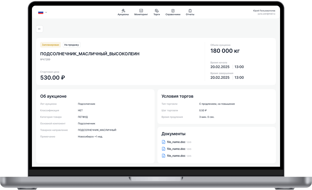 Есть два вида аукционов: на продажу и на покупку. Вся информация о продукции поступает из внутренней системы агропромхолдинга. Контрагент может торговаться только от своего лица, а сотрудник агропромхолдинга — за все юрлица, которые прикреплены за ним.