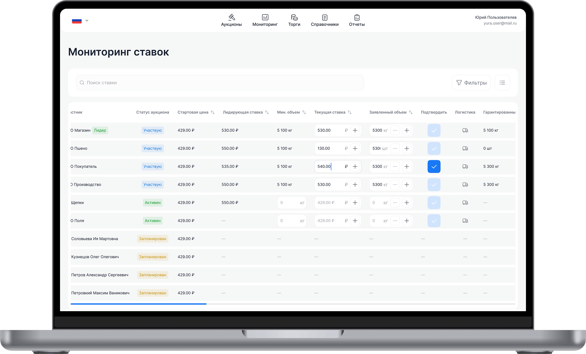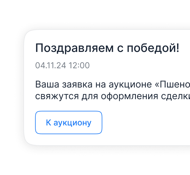 Теперь пользователь может повышать и понижать ставку без перехода на детальную карту аукциона. Особенно актуально для сотрудников агропромхолдинга, которые участвуют в нескольких торгах от лиц своих контрагентов