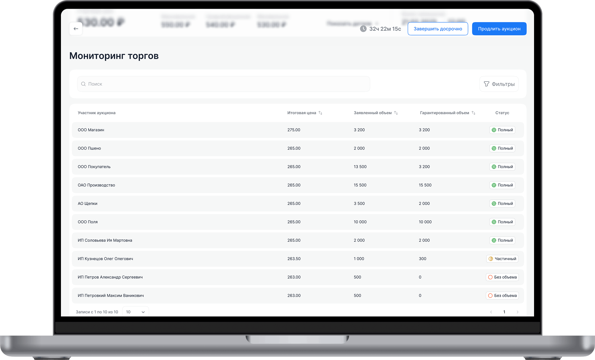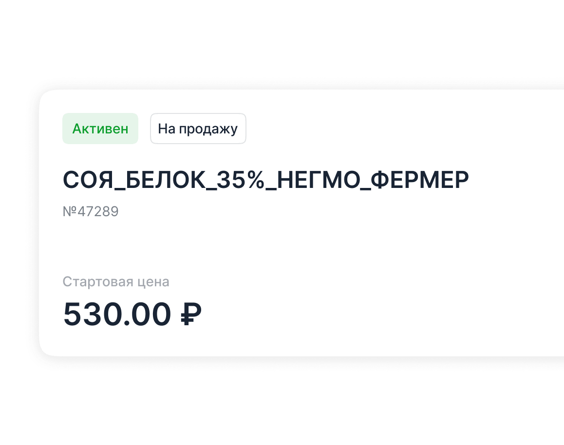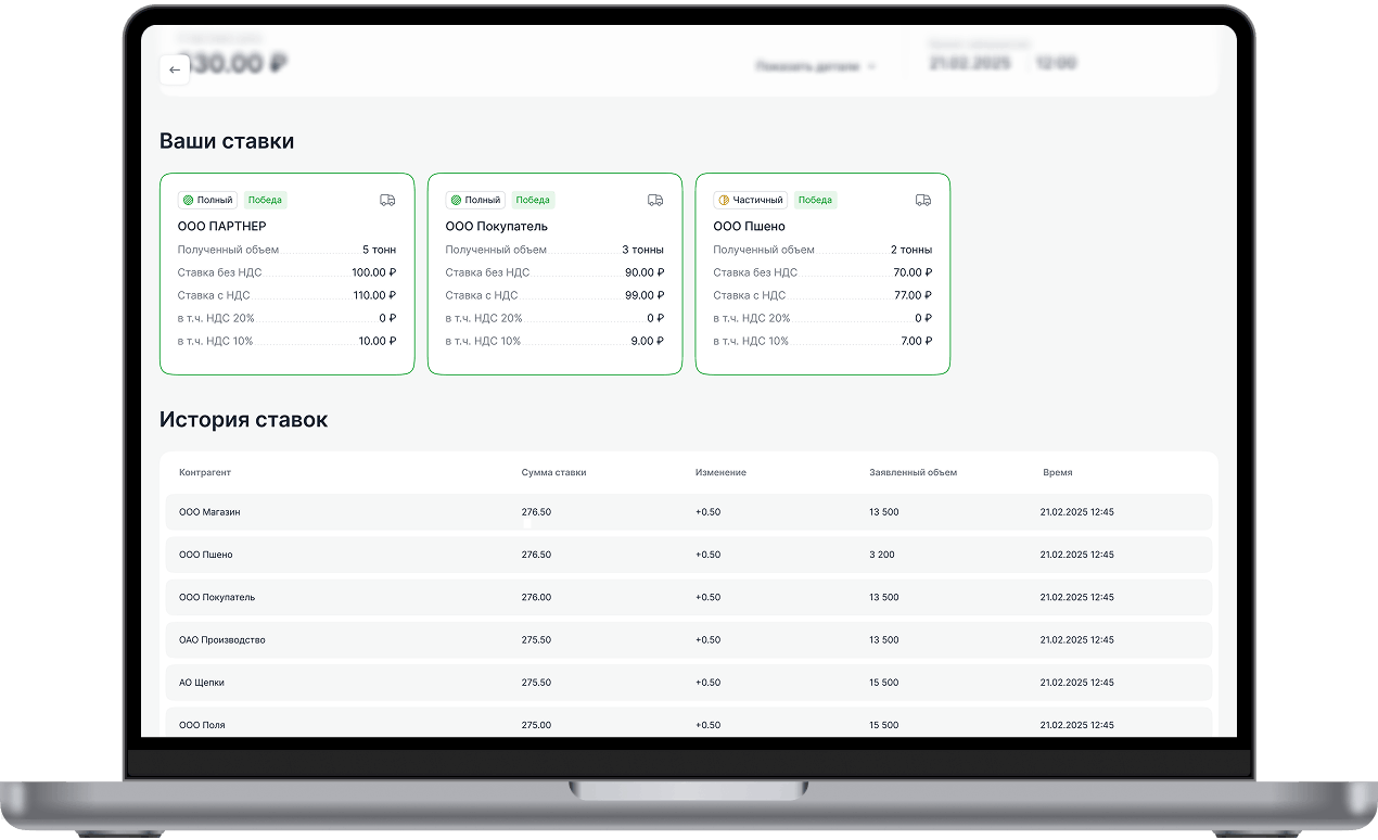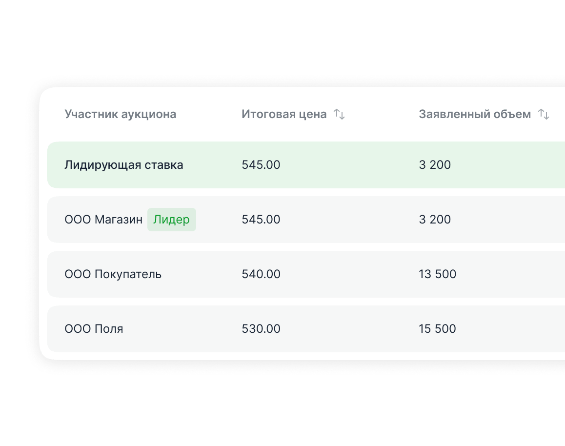 Участник дополнительно видит свою и лидирующую ставки, а на странице завершённого — историю своих и чужих ставок. При этом сотрудник агропромхолдинга видит все ставки, которые он выставил за юрлиц