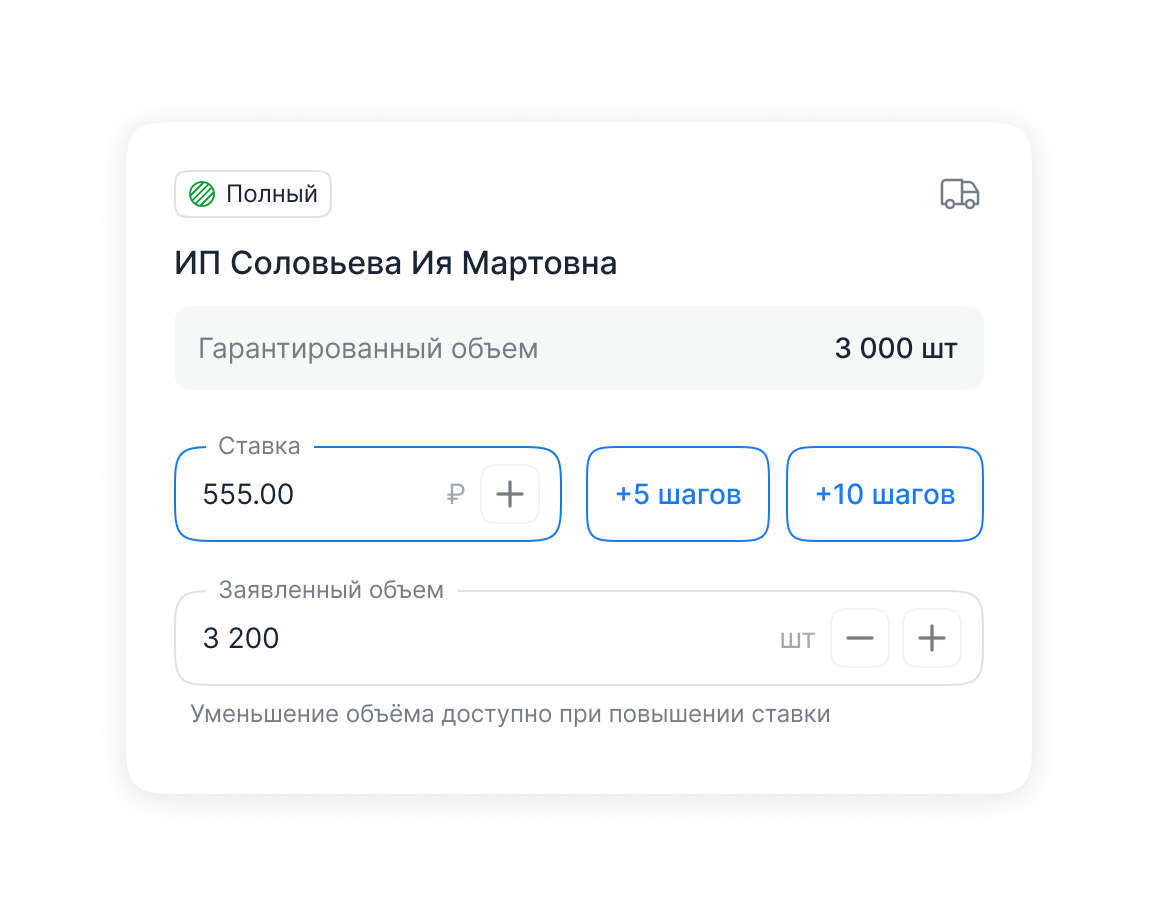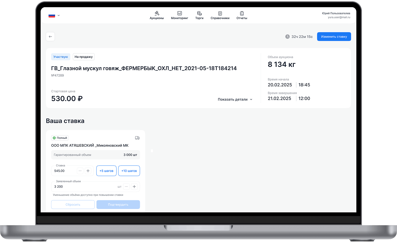 На странице активного аукциона пользователь указывает ставку и объём продукции, которую желает приобрести. Если он участвует в аукционе на покупку — он может повышать ставку на один или несколько шагов. А если на продажу — уменьшать её.
