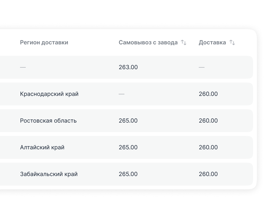 Участник видит итоговую цену: с учётом доставки или отправки из своего региона, а также типа доставки — до двери или самовывоза с завода или центра