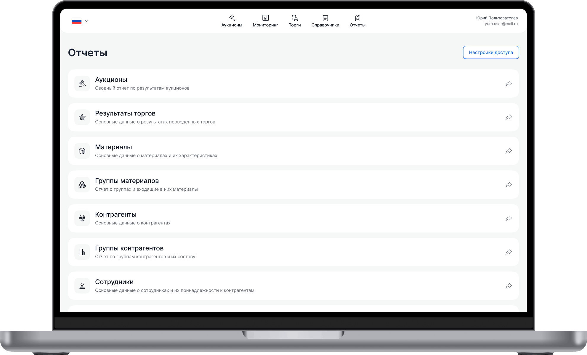 В системе можно формировать отчёты по аукционам, результатам торгов, материалам, пользователям, журналу логов и т. д.