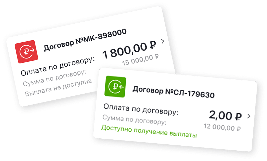 В разделе «Договоры» клиент видит все договоры: он может оплачивать проценты и получать выплаты. Для удобства приложении предусмотрена цветовая дифференциация: если пользователь может взять выплату — договор становится «зелёным».