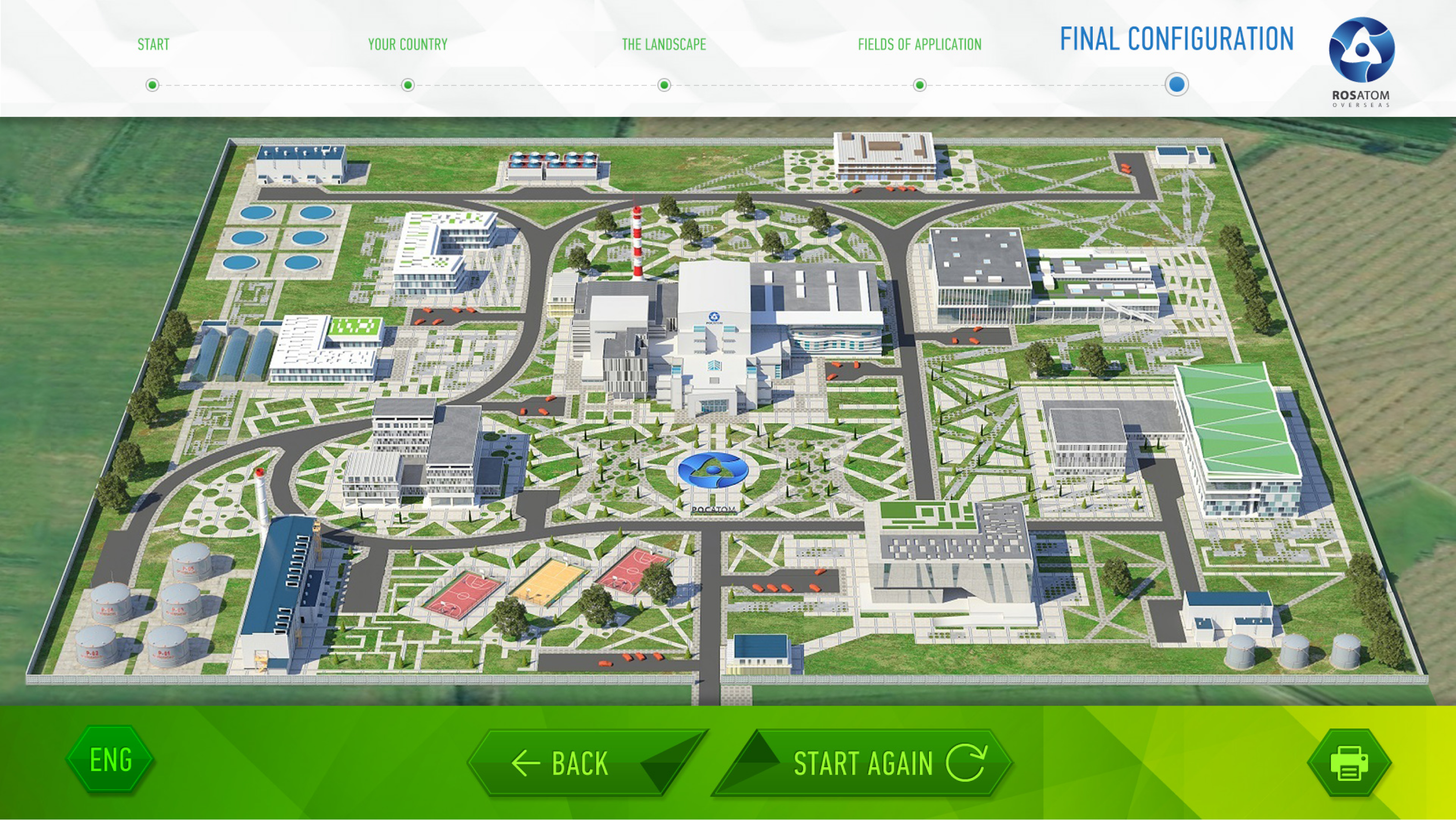 При завершении игры пользователь может распечатать результат конфигурации — 3D-визуализацию ЦЯНТ с обозначением каждого здания, описанием данного центра — всех его составляющих и областей применения.